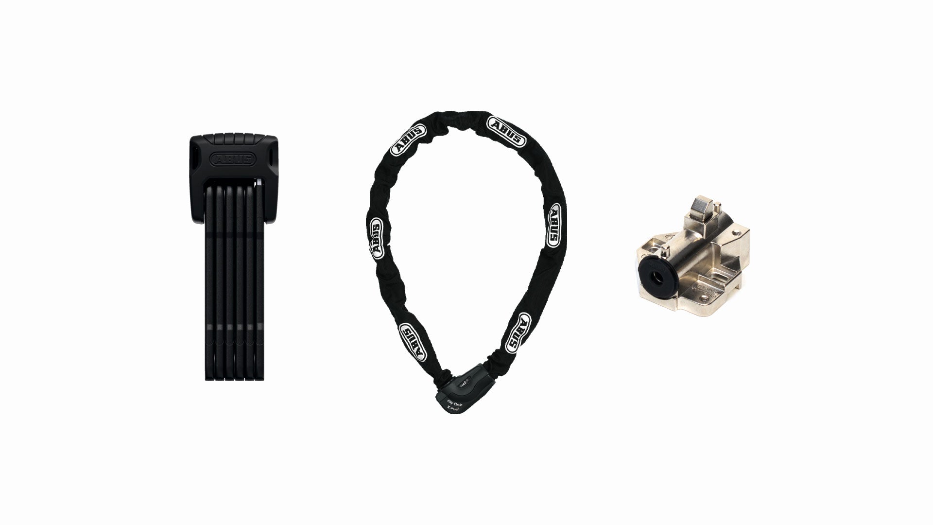 A set of fantastic Abus locks, coupled in ease of use by the One Key system. Contains the Abus Bordo 6500 Big folding lock, the Abus CityChain 1060/1400 and the STePS lock cylinder for your battery dock.